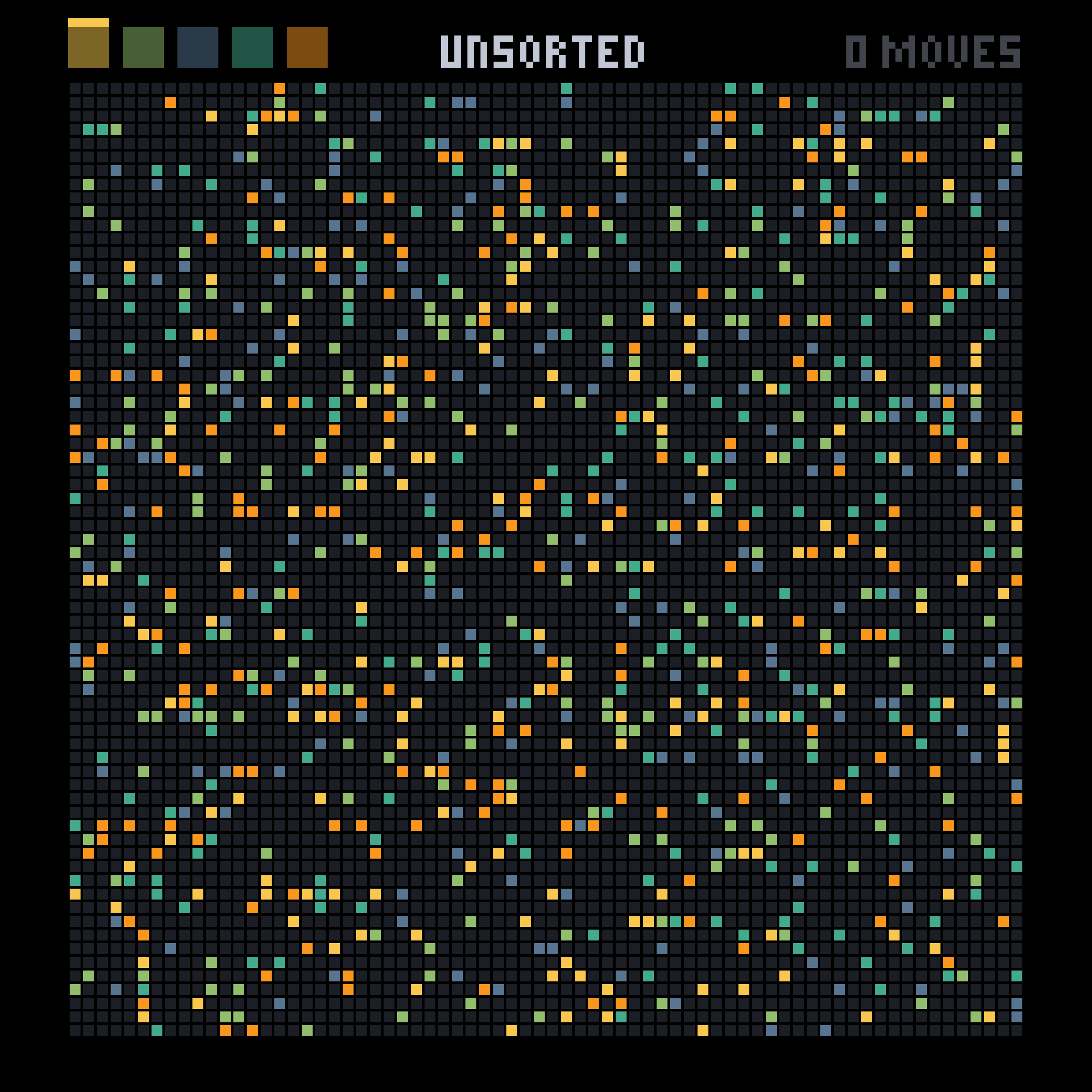 Unsorted is a generative puzzle. The goal is to sort pixels on the screen so colors are packed together into a single cluster. You complete the puzzle by clustering all colors. You can play casually or competitively. For competitive play, try to complete the puzzle in the fewest moves possible.