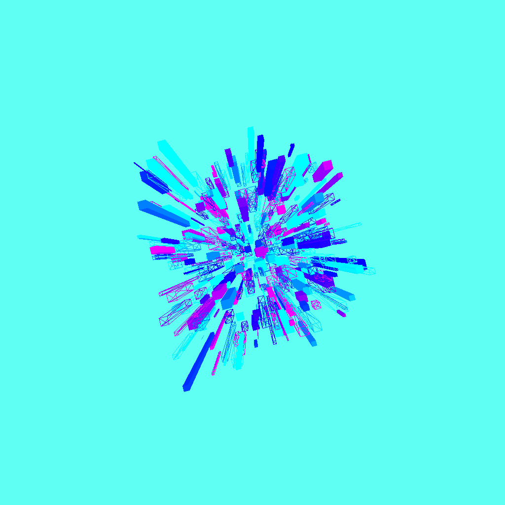 Random abstract buildings generated around a world with some different tones, sizes, speeds, range of colors, based on hue value with a fixed saturation, and evolving through time.