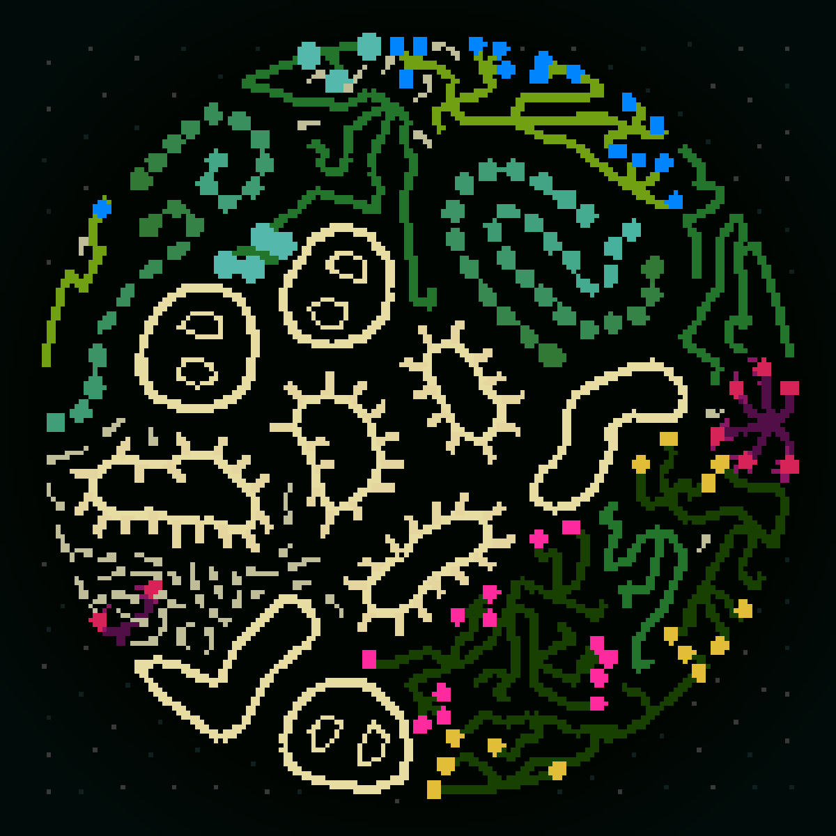 The "spaceplant" series expresses this "computational beauty of nature" (a phrase borrowed from Gary William Flake's book of that title) through a lo-fi simulated garden. This garden has been grown by collecting, curating and nurturing algorithmic specimens that inhabit a space both cellular and planetary. A symphony of particle forces orchestrates the form and interaction of the simulation, tuned to cosmological constants by the artist.