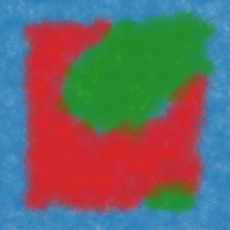 While the final result is a static image, the live view visualizes how the image is generated. It goes something like this: you start with a grid of cells in random colors, and you feed that into a carefully customized cellular automaton, where the color of each cell is determined by the color of that cell and its neighbours in the previous generation. If you end up with a single color over-powering all the others, or too many different fragmented colors, you start over. But when you reach a stable state with two or three colors, you have achieved your goal: a mathematical balance in color and composition that tends to be aesthetically pleasing as well. You then select a suitable canvas color and run a more computationally intensive rendering process, which makes the end result look more like physical paint on canvas, while retaining the subtle traces of its digital origins.