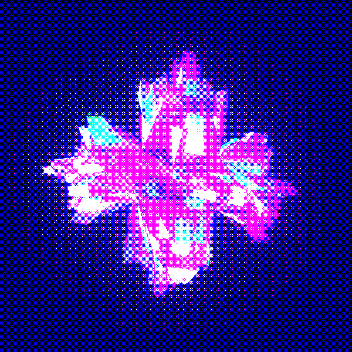 Crystalyxes are crystalline-like artificial organisms with transparent, iridescent and faceted membrane which forms their main body. They are first protocells to have evolved a triangulated mesh capable of rendering simple material properties like translucency, specular shine, color variation and luminescence. Not resembling any organism found on Earth, their compositions are named after precious stones, with the most common one being lapis lazuli. Rare ruby and emerald compositions are also occasionally observed. Crystalyxes come in 3-bit as well as monochrome variants, with latter being rarer. Structure and dynamics of each crystalyx is guided by behavioral features like reconfiguration (affecting topology) and modulation (affecting geometry). They inhabit both darker and light-abundant environments. Some mimic the color of their environment for camouflage, while others create contrasting shades to intimidate competitors. They are rendered in real-time in your browser and can be interacted with by pulling the tips of their facets.