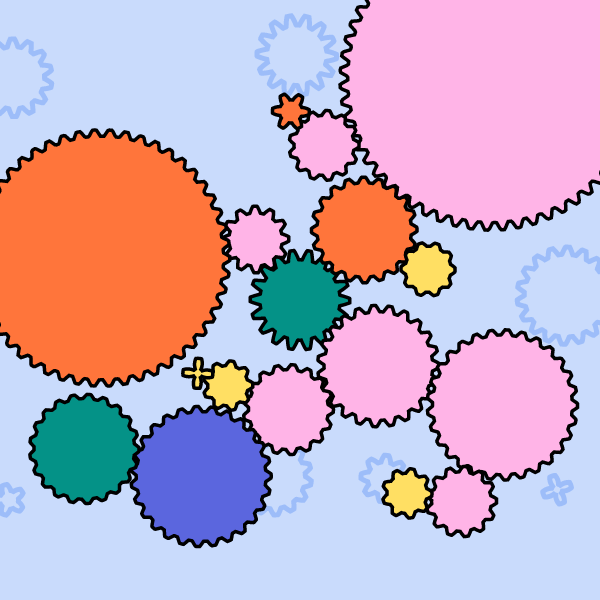 After exploring math for a few days, I was able to build a few connected gears. Gears are connected in a tree structure with the central gear as the root. Gears connected to each other move in different directions.