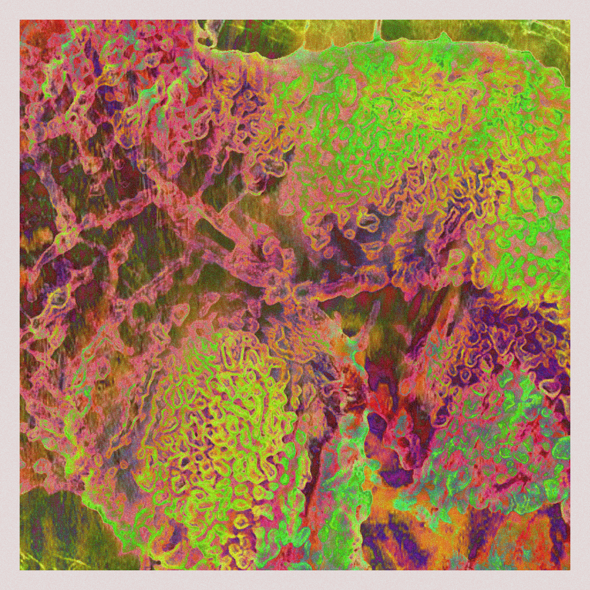 Microbes, bacterias, viruses, fungi, eyes, nebulars, etc. are distributed over three layers to illustrate the similarities between the microscopic and the macroscopic.