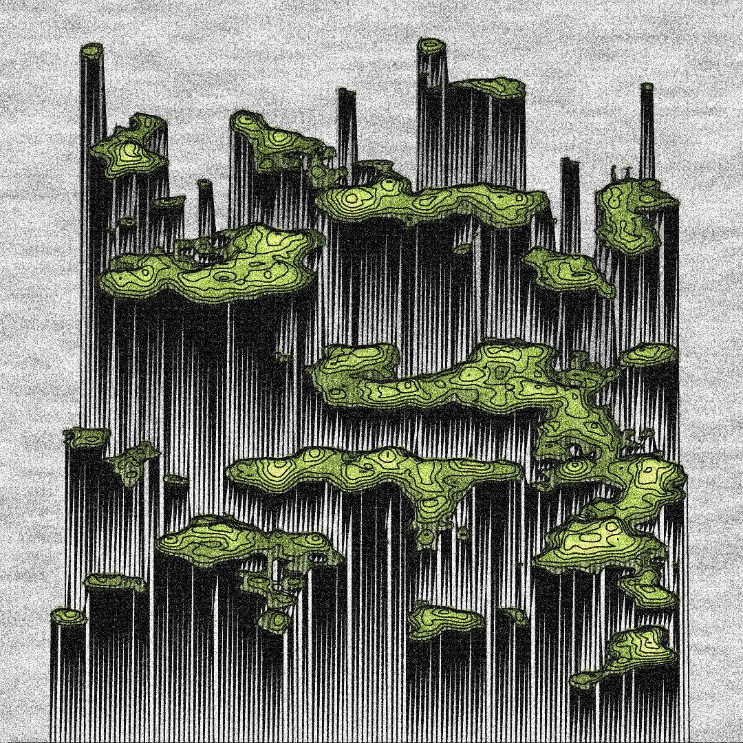 The collection is completely generative and written with p5.js. It began as an exploration of the dual contouring algorithm and purposefully builds on a bug I introduced when filling the contours by selecting vertices out of winding order.
