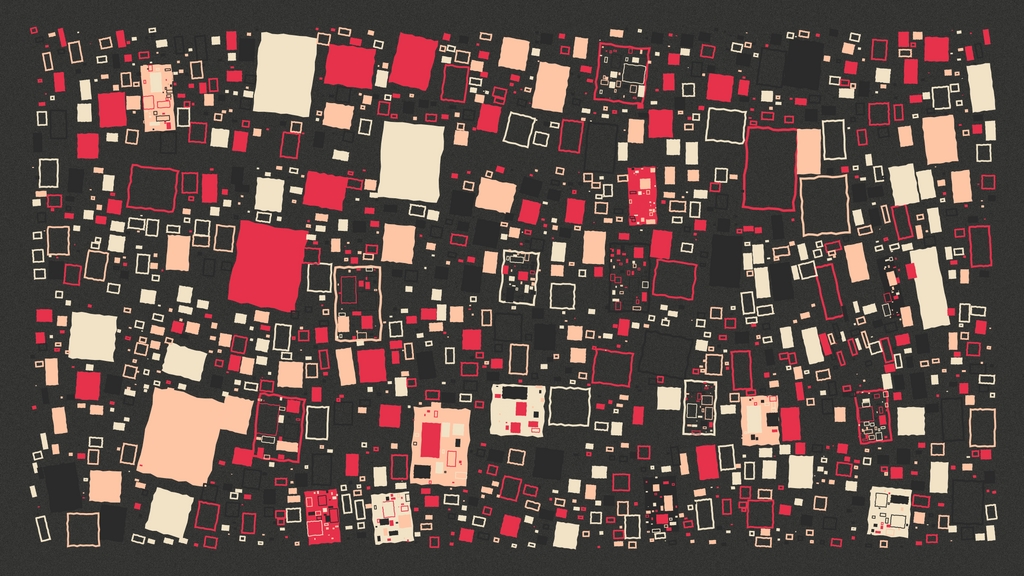Memo is created with P5JS. Large number of rectangles are packed in loops to the canvas with a random rectangle packing algorithm with simple collision detection.
