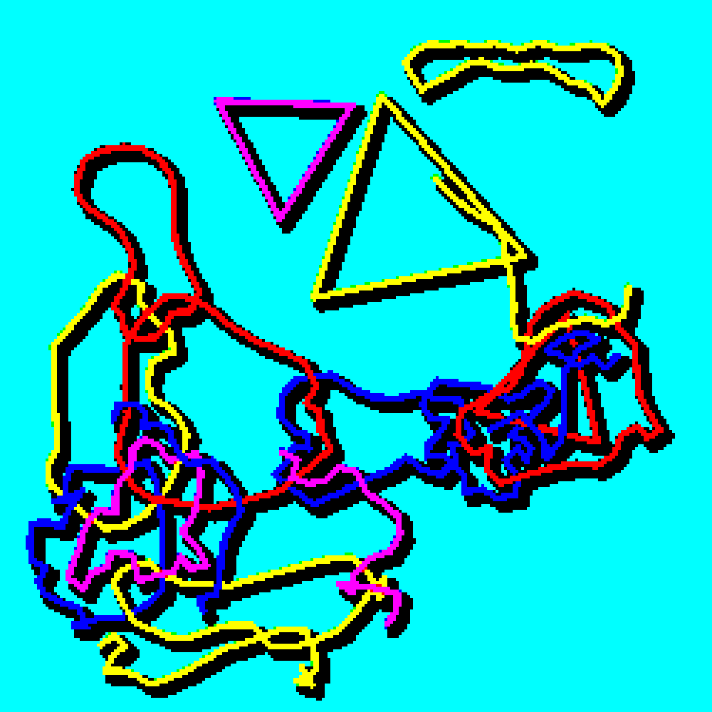 Generative animated drawing inspired by mindless doodling and low-res CAD graphics. Custom physics engine made with vanilla javascript. Colors quantized with GLSL. By @galoandstuff.
