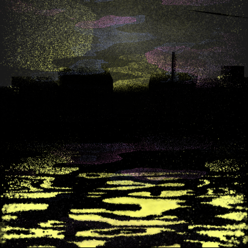 The bottom half of the picture is dedicated to a body of water, usually in the same main colour as the sky. Dot-size and density are altered towards the bottom of the piece, providing a slight feel of perspective. Additionally, dimming effects are overlaid near to the centre of the piece to subtly enhance the feeling of depth.