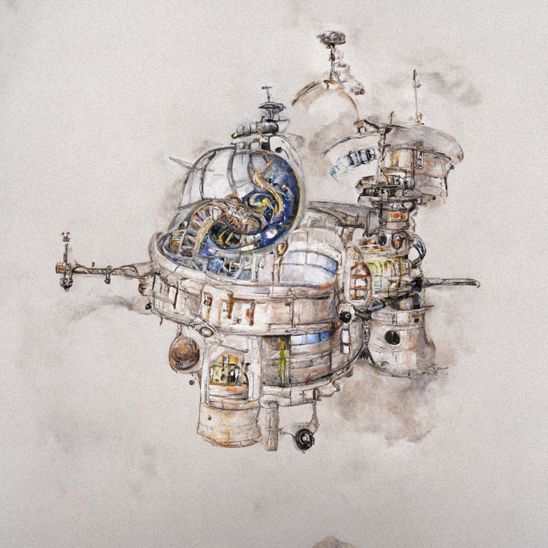 In this work, I took a hand-drawn sketch as a basis, transformed it with a neural network, and randomized the mutating space station modules using code.