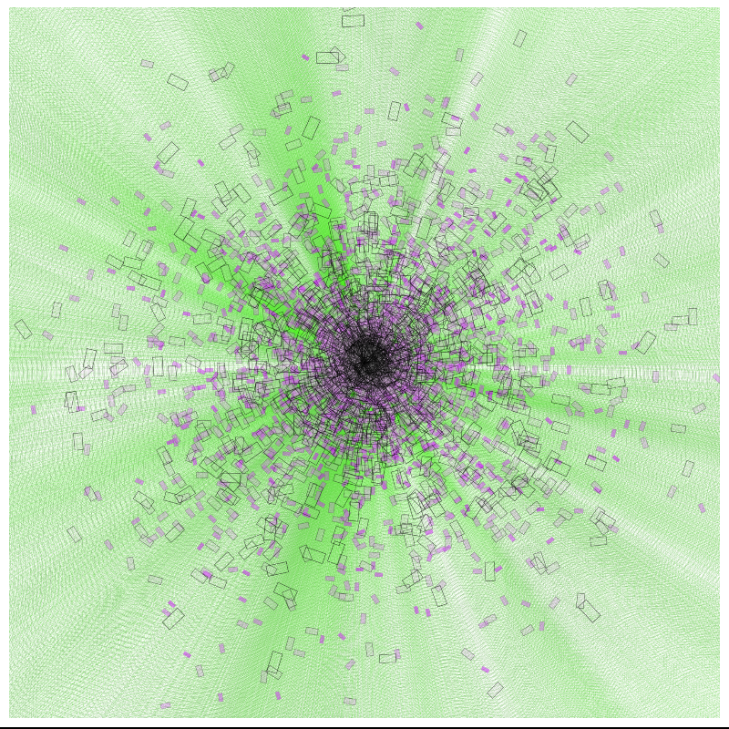 Lace background; scattered rectangular blocks. Rotation chosen using random values, but within certain limits. They spill over the canvas and change opacity as time proceeds. Lines delineate the outcome, and the background is reminiscent of the guilloche patterbns used to prevent numismatic fraud. In honour of the fact that one scene with Margera remained in the film despite the lawsuit, which sought to cancel the movie's release. If only it had succeeded…