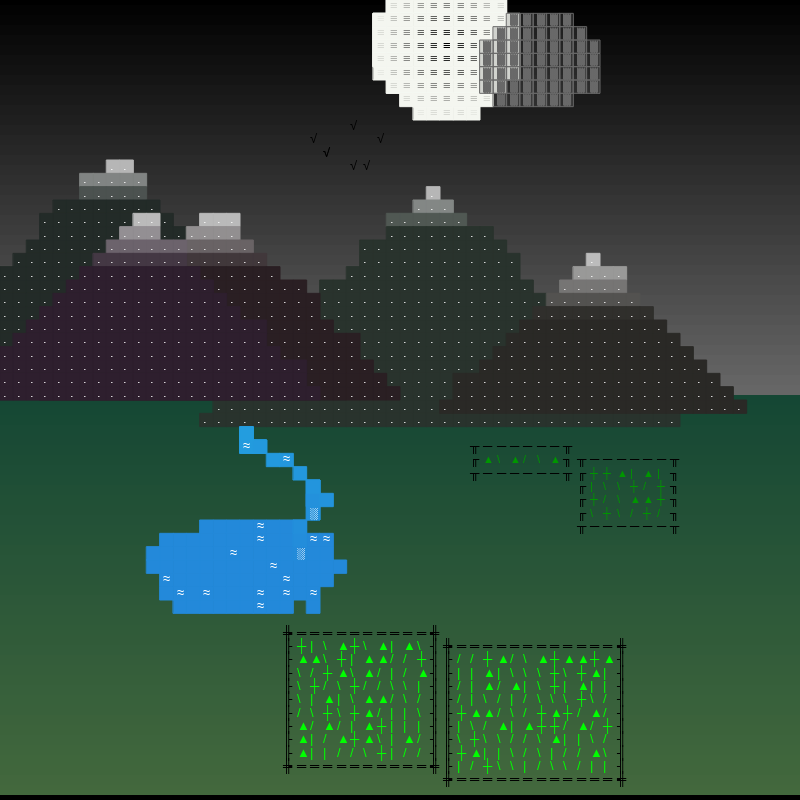 This token takes Ascii Landscapes and adds a time element. Each token randomly generates scene components like Mountains, Hills, Fields, Far Fields, Pond, River, Birds, Clouds and a House. Then the code grabs your system clock and generates the sky based on the time. Because the Sun/Moon or symmetrical, the code does it's best to give a decent sky. The day starts early.