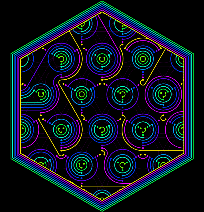 Many palettes with varying rarity, also varying background, scale and constraints on the type of connections possible. Use 'a' on the keyboard to randomly change the connections while all variables remain the same. Created in p5.js