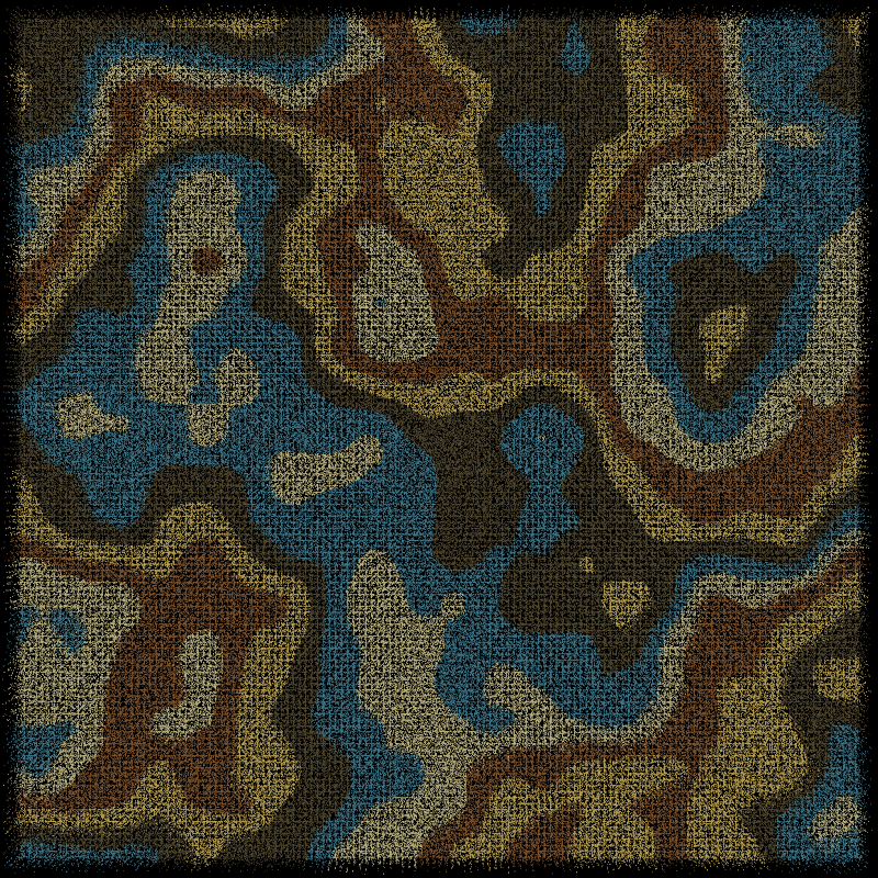 The patterns and colors are generated by using parameterized Perlin noise, and a custom algorithm is used for the canvas-like texture. The canvas texture was especially satisfying since it is generated very fast by manipulating the z values with trigonometric functions. This allows Tapestry to render efficiently on any screen size (see the Responsive section below).