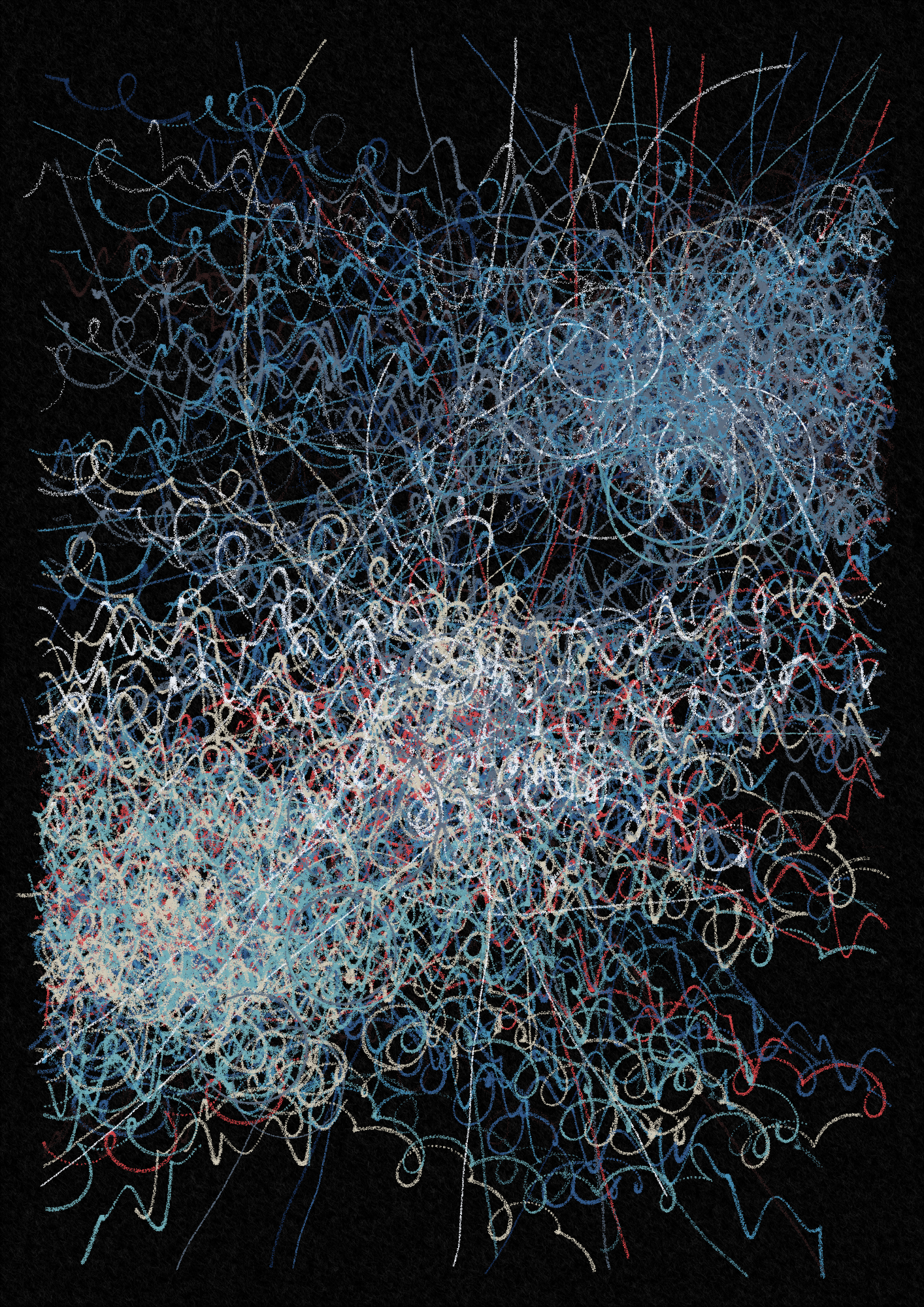 pang reflects emotions that take control of our impulses – anguish, euphoria, obsession. By using crayon-like marks, the artworks convey the catharsis felt while drawing with a childlike abandon. To capture what gives such marks true feeling, the works deliberate the intrinsic movements, pressures, and angles shaped by hands in various moods. These qualities and their frenetic meanderings represent the infinite possibilities of where the crayon could go next – if only we could free ourselves from the layers of control we've built.