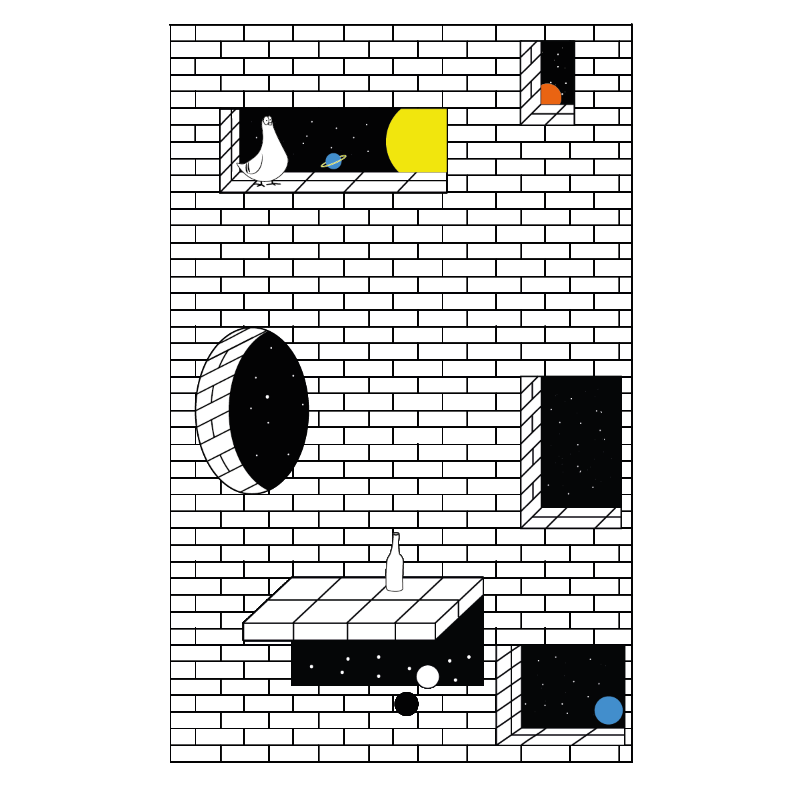 A wall, portals, a pigeon, a cat and a few other things