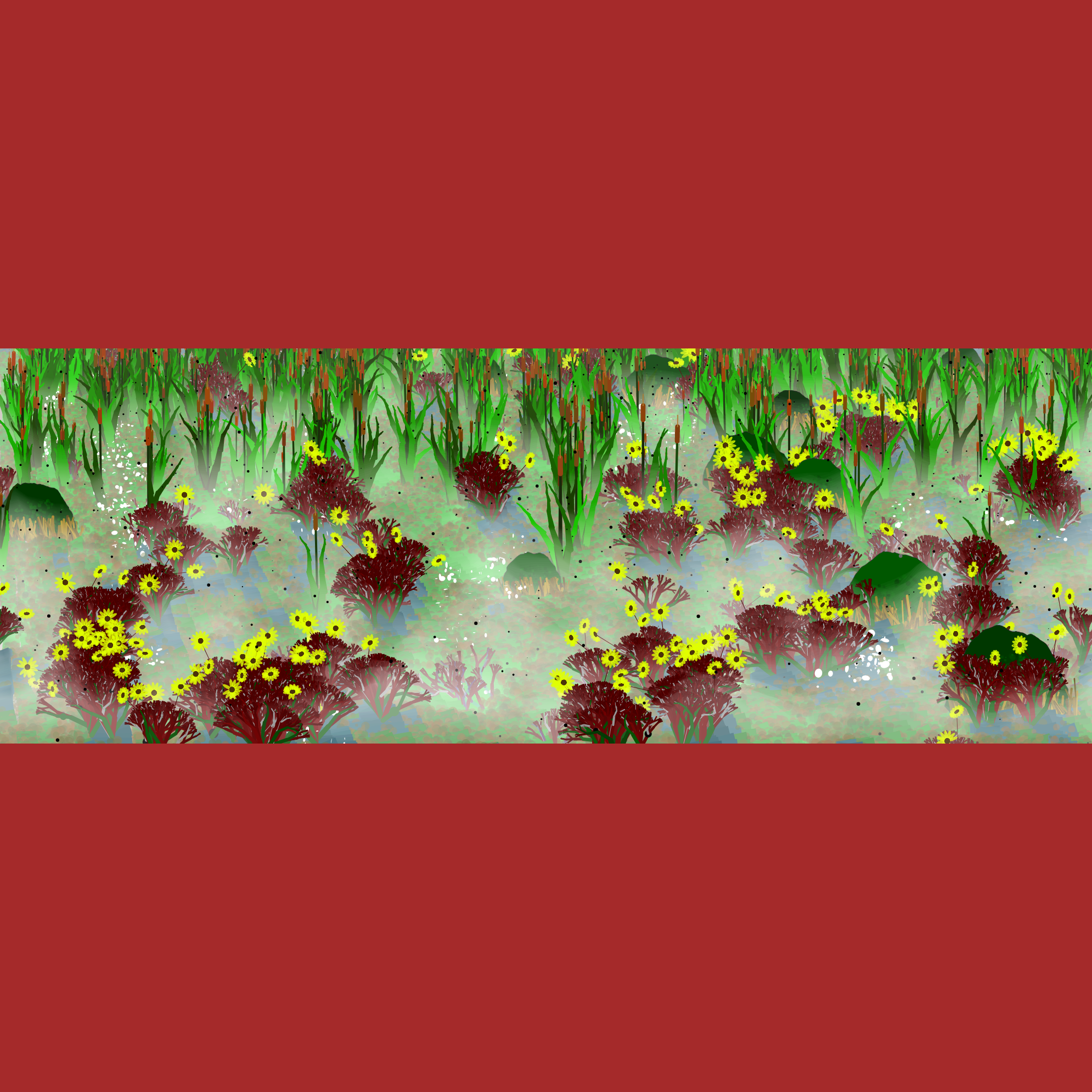 Enjoy the peaceful solitude of a cool morning in this floral, marshland landscape. Features include generative cattails, bushes, rocks, moss, mushrooms and flowers in a random palette scheme framed in lush, verdant foliage.
