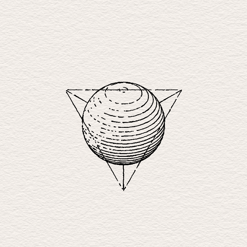 Diagrams of patterns on spheres, planets, fields, and platonic solids rendered isometrically. Ink on paper (on js).