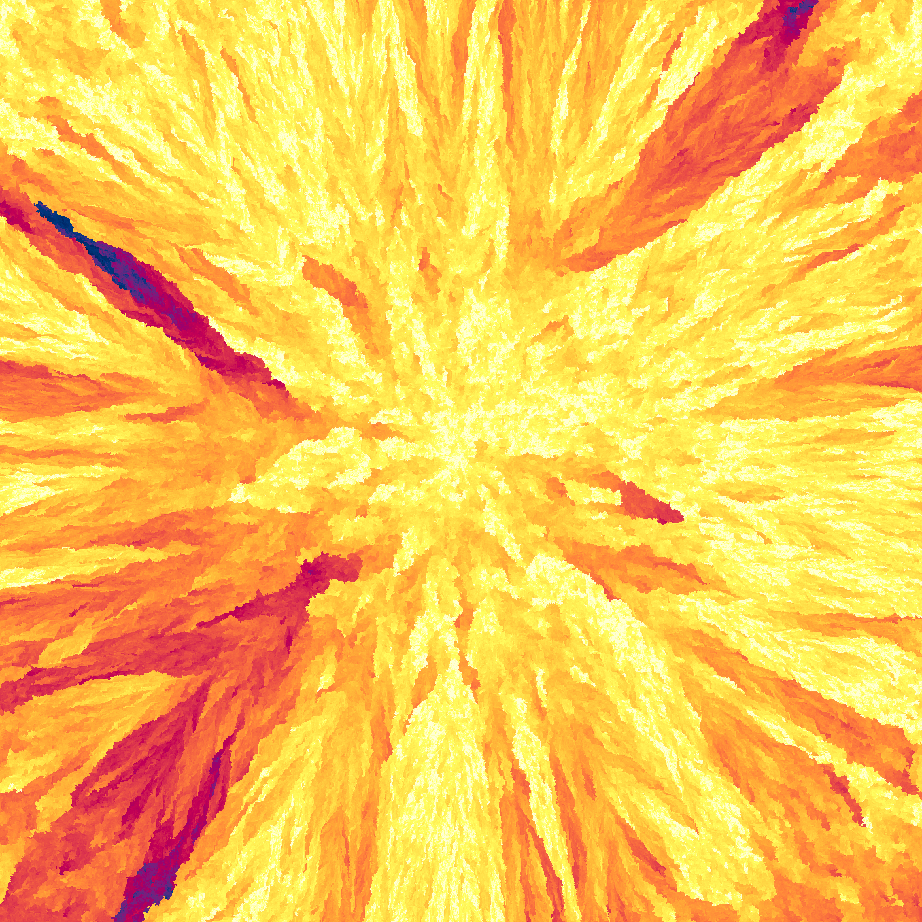 Each Dragon Fire design is painted from a random 100 color gradient on a 3200x3200 canvas using p5js. This version includes performance optimizations including an "edge pixel" algorithm that allows for a much higher resolution painting that renders over 10 million pixels in a fraction of the time compared to the original.