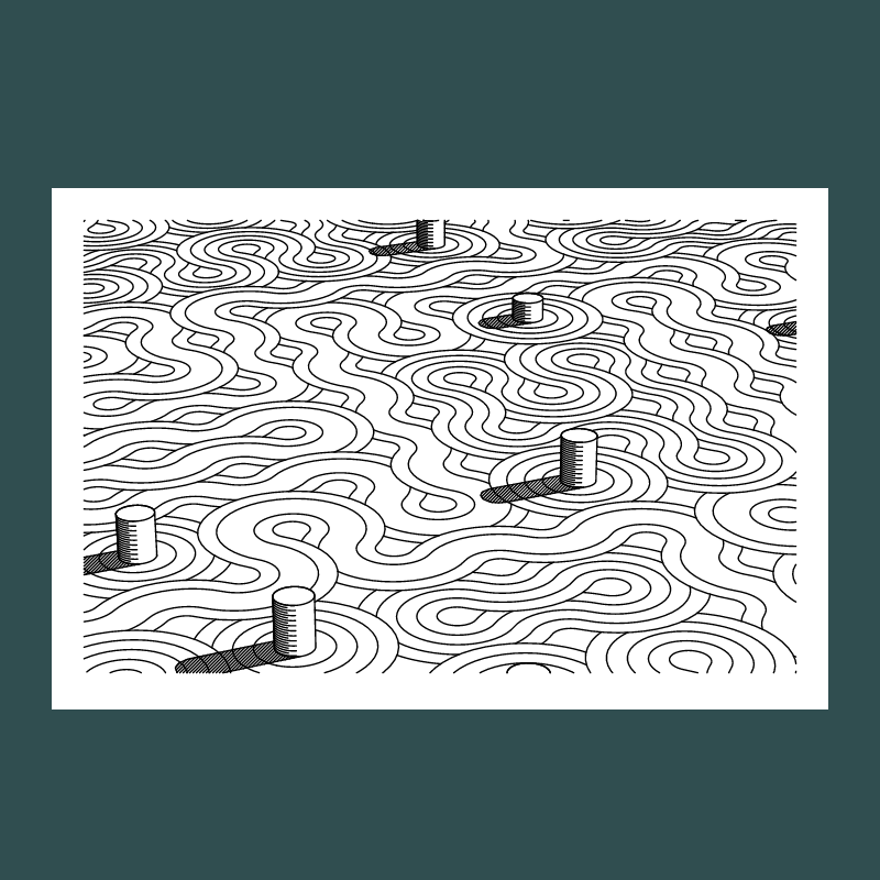 Curved Truchet tiling is laid down on a 3D plane forming an imaginary landscape of ripples.