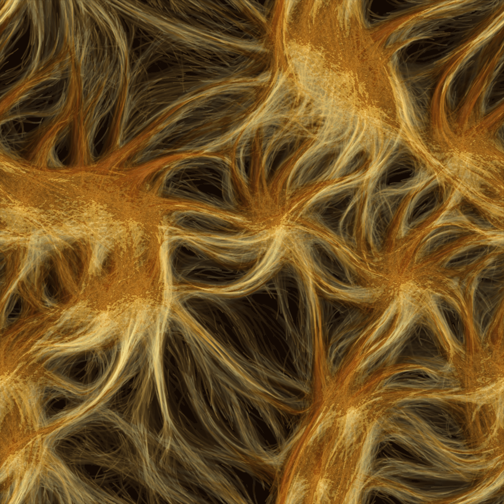 Stigmergy is a method of decentralized organization in which agents communicate by leaving traces in a shared environment. This piece simulates a kind of stigmergy among a large population of particles. Each particle leaves a trail behind it as it moves, and determines its direction of motion based on the trails around it. The rules for how a particle should move based on its surroundings were created with a user-guided evolutionary process.