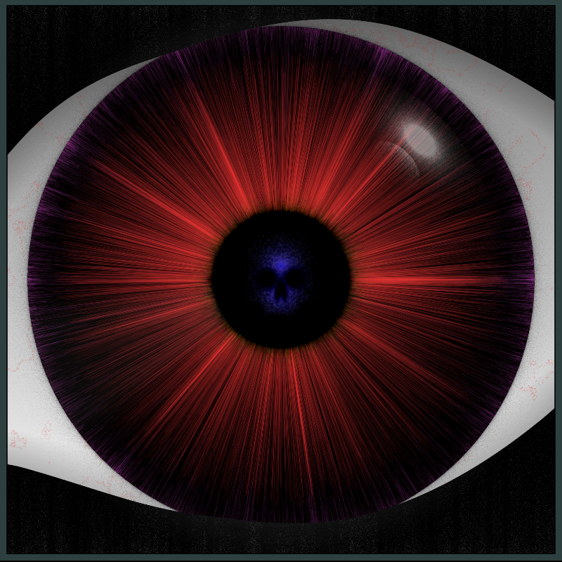 I decided to recreate ‘Eye’ generatively, my intention being to produce an infinite range of pieces based on Escher's painstakingly-constructed original. The iris, pupil, skull and eyelid are generated using random processes, shaped with the aid of probabilities and limited colour palettes. Layers are built up over a sequence of three hundred and sixty frames. and the skull is formed from a cloud of shaped, random points in the centre of the pupil.