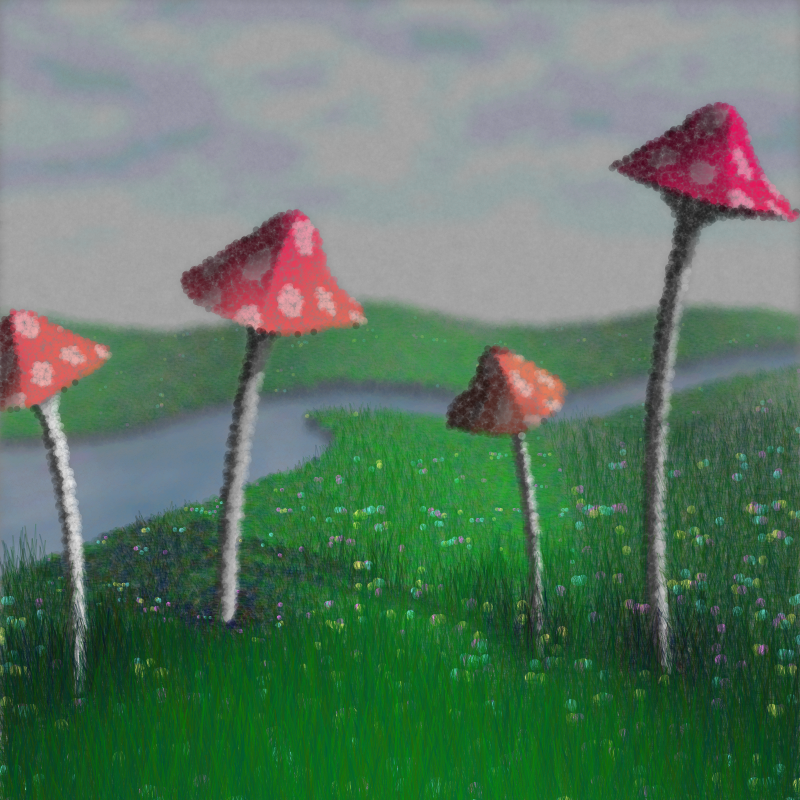 For my first drop on the new fxhash v1.0 I wanted to make something different. So I challenged myself to write a raymarcher like the ones I use in my shaders but in p5.js and make a fully procedural scene with it. It's a bit tricky to work with vectors once you are used to GLSL, but I managed to write a decent algorithm that scans a grid and slowly draws the image. It draws it with circles and triangles for the grass. The first thing I used for testing was a SDF of a plane with some tall bars on it. Then I was trying different distortions on the shapes and in one moment the results gave me the idea of a scene with mushrooms and grass on an undulated terrain. Later I added a small river and a cloudy sky. I think I was inadvertently inspired by some children's books I had when I was a kid.