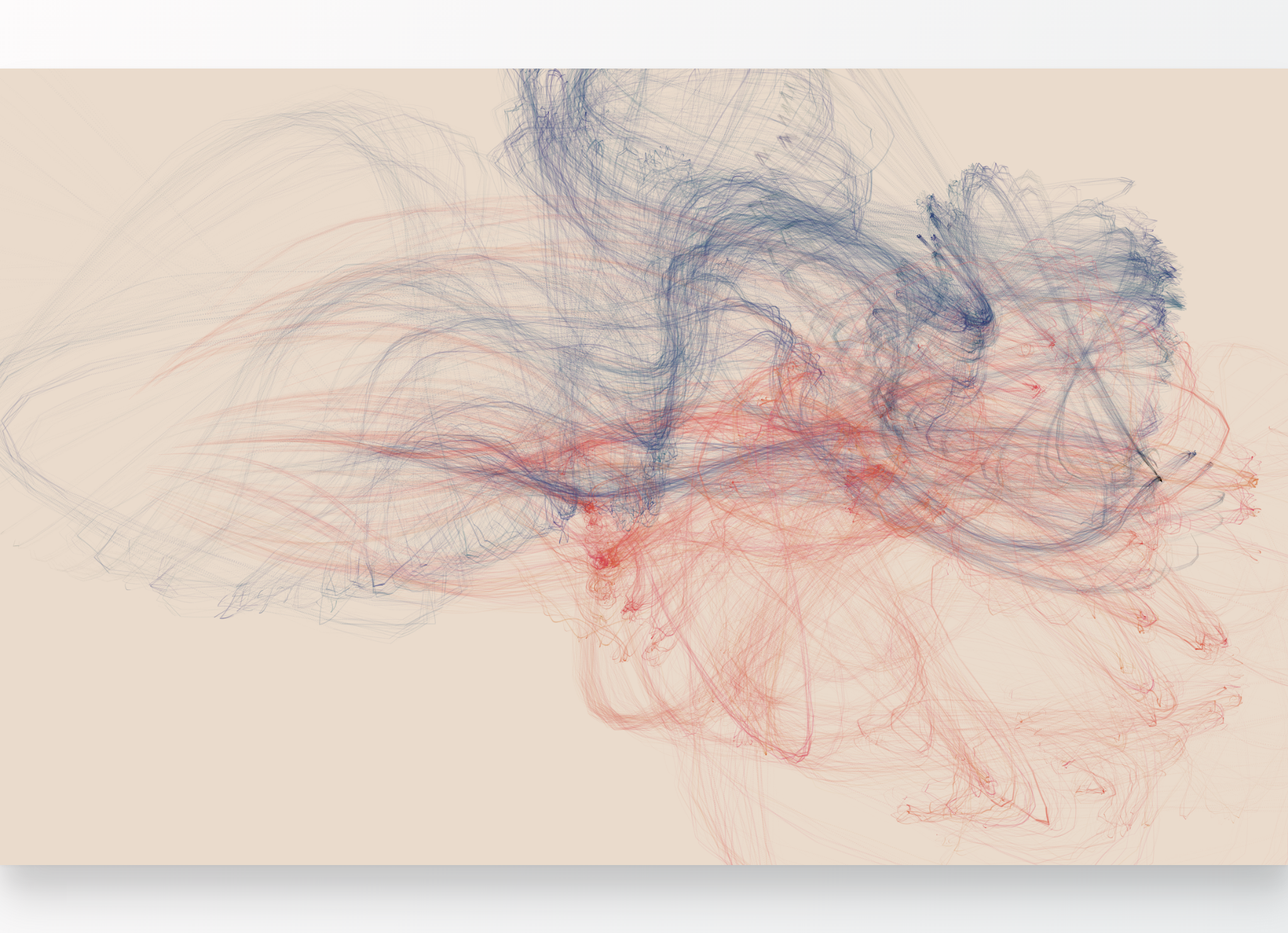 Two meandering paths are created with opposite flow vectors. The paths are drawn with a twisty drip brush.