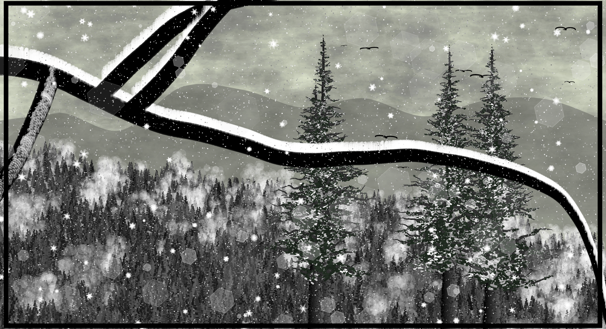 The Weight of Winter features a generative atmosphere with distant mountains; flow-field conifer trees on noise-wave foothills; a random cluster of subject conifers in the mid-space; and a flow-field tree branch with an interpolated dusting of snow. Diamond dust – small spears of ice – are simulated with an optical-effect along with random snowflakes. A generative ‘conspiracy’ of ravens are scattered along the tree tops.