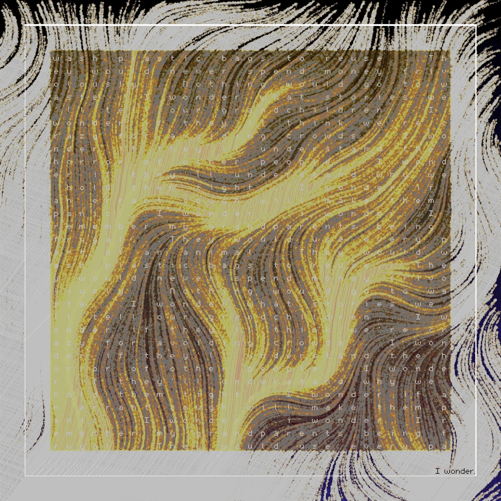 [i.wonder] is an exploration of parenting and how historical events can impact parents and their children. Our grandparents grew up during the Great Depression and lived through eras of war. At times, commodities were scarce or unattainable and one had to ‘make do.’ Nothing could ever go to waste - everything had to be washed, reused, fixed, stitched up. Their eccentricities now reflect those times, leaving their children to shake their heads at their extreme frugalness. Consumer culture has eviscerated this ideal in current generations, yet they still continue on.
