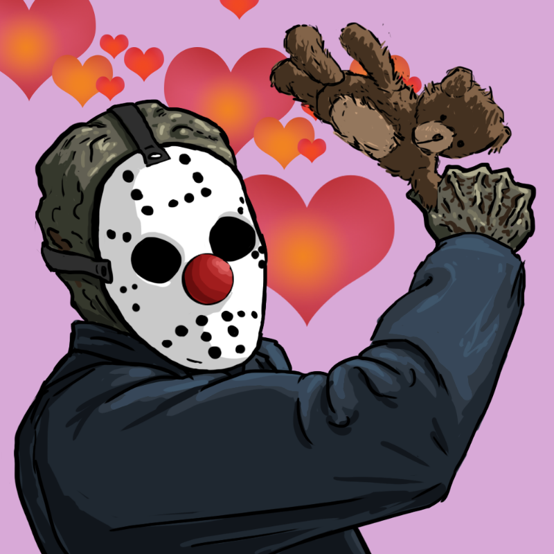 Is Jason attacking someone just outside the frame? Might he be snatching the bride’s bouquet at a wedding, or is he viciously murdering someone with it? Is he about to smash someone’s head in with a teddy bear, or is he protecting it from an angry dog?