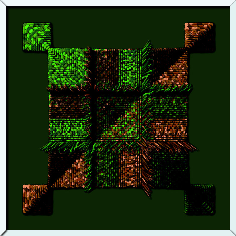 Combining the use of different palettes with some movement conditionals - functions back() and go() - and a charming touch of shading and depth, 'Intricated 4x4' can be considered one of my favorite