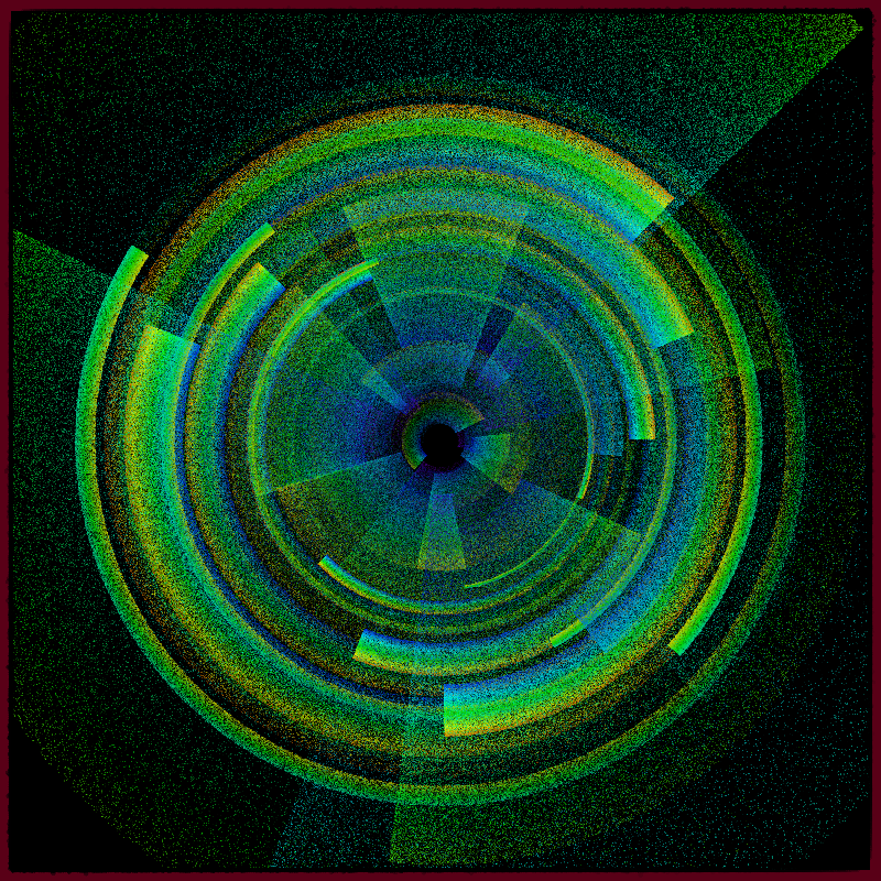 For this piece, palettes are not hard-coded. They are, however, carefully manipulated by selecting an initial hue value and working from this point to produce colours with various limitations. Some renders will be monochrome, or near-monochrome, whilst others will select from the full range of hues available. Others will cluster near to a central point, with one or two circular gradients taking up a contrary position on the colour wheel. There is the chance of a lighter rendering mode, something that may be considered a rare feature.