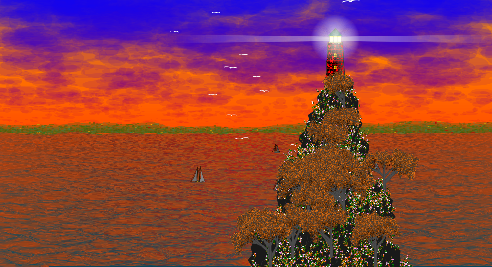 Generative skies, land, sea, boats, birds, rocks, trees and more explode in this impression of the coast. A day and night scene are randomly picked and painted using several of generative systems. See if you can spot all the details!