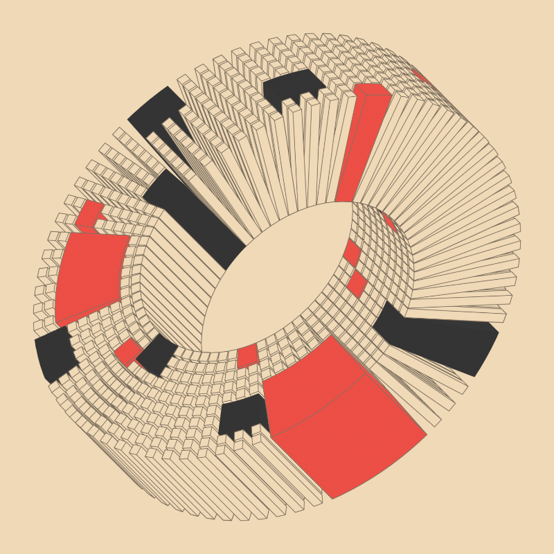Each output in this collection has the same "mobius" shape, but the number and positions of the colored regions varies.