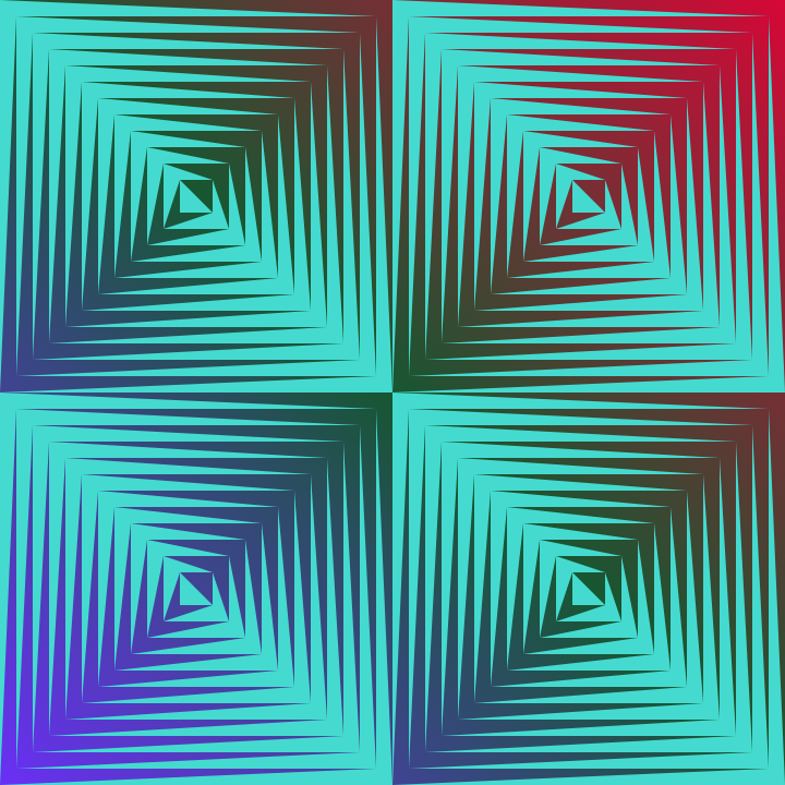 Brain Boggle is a multiple square arrangement of the original work. I was able to decipher Vasarely's painting into an algorithm and thereby generalize it. I can vary the number of points in each half of the square and I can rotate the square in 90 degree increments. I like putting the one of four rotational variations of the piece together in a 2x2 array. All the pointed shapes are one random color. To me the interactions between each section is more interesting than 4 instances at the same rotation angle.
