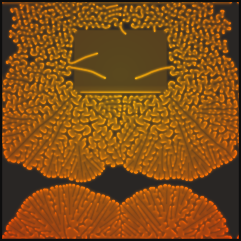 a.k.a. Reaction Diffusion. The canvas is a grid of cells, each containing some amount of A and some amount of B. Every step, A and B react with each other and diffuse into neighbouring cells. The amounts of diffusion and reaction have different settings, which can vary across the canvas or over time. Then, cool things happen with colours.