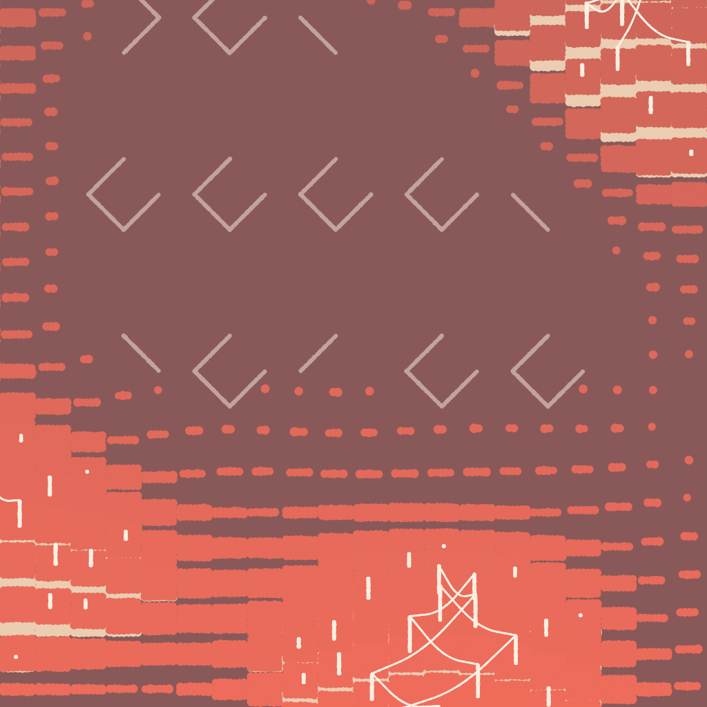 As cells empty, they eventually host simple lines, drawn together in a few restricted angles to form naive patterns. As cells instead fill up, they grow into organized grids of towers. When they reach their highest possible value, they attempt to link to each and often devolve into a different form of chaos.