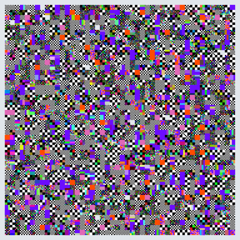 Patterns for the individual blocks in the grid are divided into categories, and various amounts are picked for each work, with dozens of possible mixtures. Patterns can flow in different directions across the varied canvases. Distribution of these patterns across the grid varies from work to work, providing for different feels as they bunch together or spread apart.