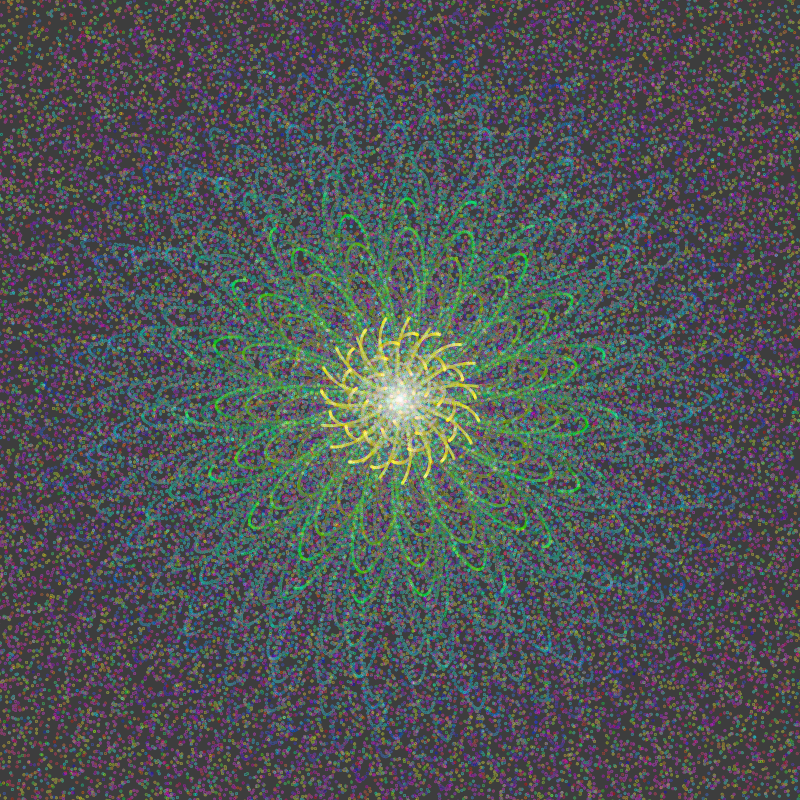 A large number of particles, chosen randomly, are rotated in space according to a sine-based function. Colour is chosen according to angle, direction and the given hash. There is a small chance of a narrow-radius, circular mandala, and a greater chance of a pouring, changing flow of particles from the centre outwards. The movement is controlled by three parameters of varying size.