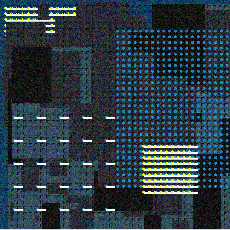 Generative Art that consists of basic shapes whose coordinates are randomly assigned. The Composition inspired by PCB board and Floor Map.
