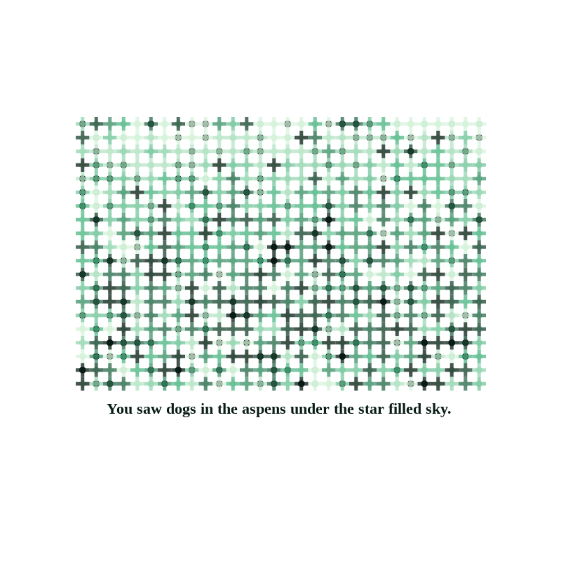 "Breakthrough Moment" is the result of an algorithm originally started in June 2021. Each piece is generated from a grid of pegs with marks on top or below. It came about after working on printing presses and screen printing especially dealing with overlaps and negative space. I imagine that each piece is slowly being typed out on a machine. The results range from op art to a marked up bingo card. Prose is generative, in my own writing style, and the result of lots of editing. Each line of prose is grammatically correct and should stand alone as a moment. My only hope is that each output is considerably different than the last.