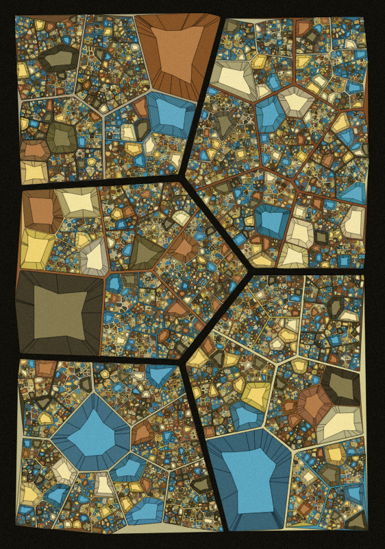 Abstract artwork that generates urban-like structures viewed from the sky.
