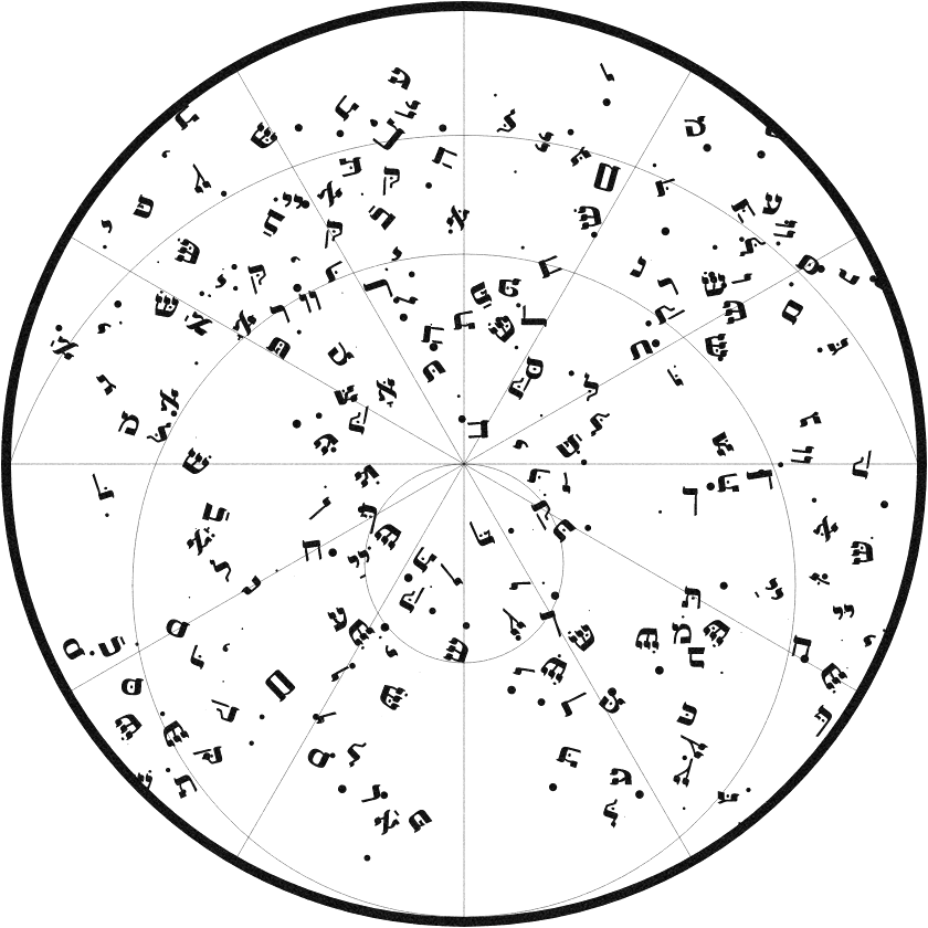 This artwork is a tribute to the Hebrew script. It's a generative version of the celestial map created by Jacques Gaffarel in 1629 found in his most famous work 'Curiositez Inouyes'. It has a light and a dark version.