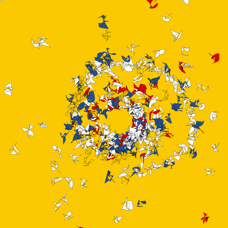 Spirals are also used to conceptualize entropy, spiraling out of control, the downward spiral from order into chaos. Each of these works represents this form of spiral, with varying degrees of chaos versus order, a formerly-cohesive group throwing off parts of itself due to overwhelming centrifugal force.
