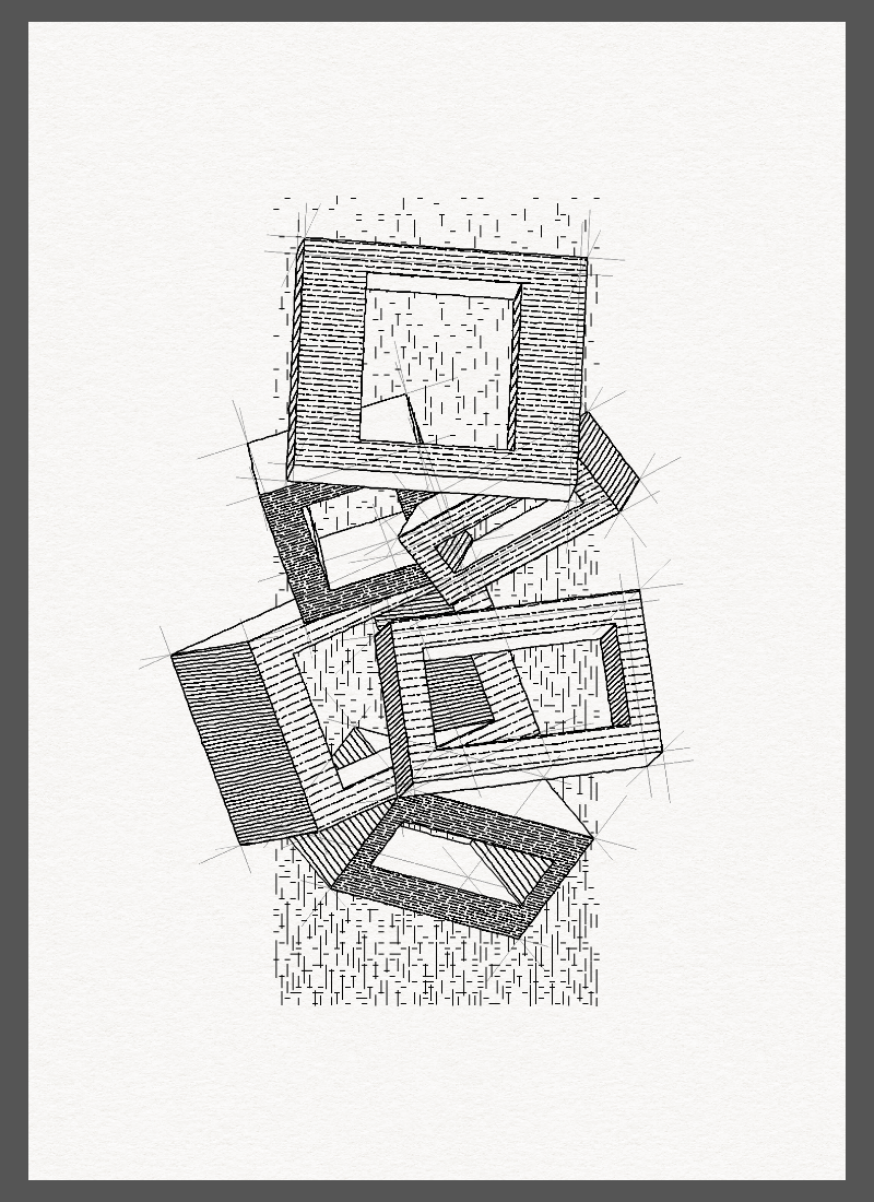 Six hollow cubes tumbling through space quietly, enjoying their six degrees of freedom. Only a single machine is there to bear witness. It is Sentinel 31, and its mind wanders. Distracted, it recreates the scene, drawing imaginary lines with an imaginary hand.
