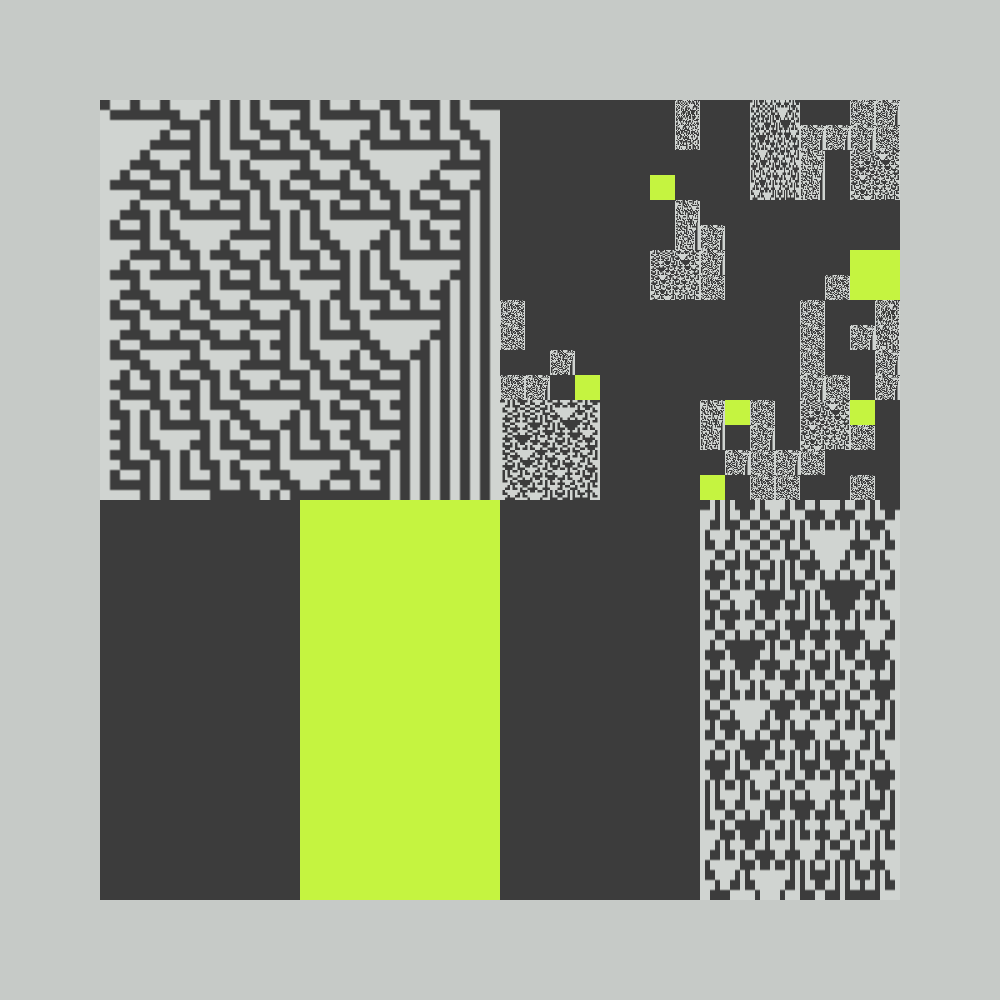 The audio synthesis consists of a stochastic melody that emerges along the division of the new areas and territories within the image structure. This melody is complemented with tiny micro sounds, triggered by each new generation of the surface mounted cellular automata.