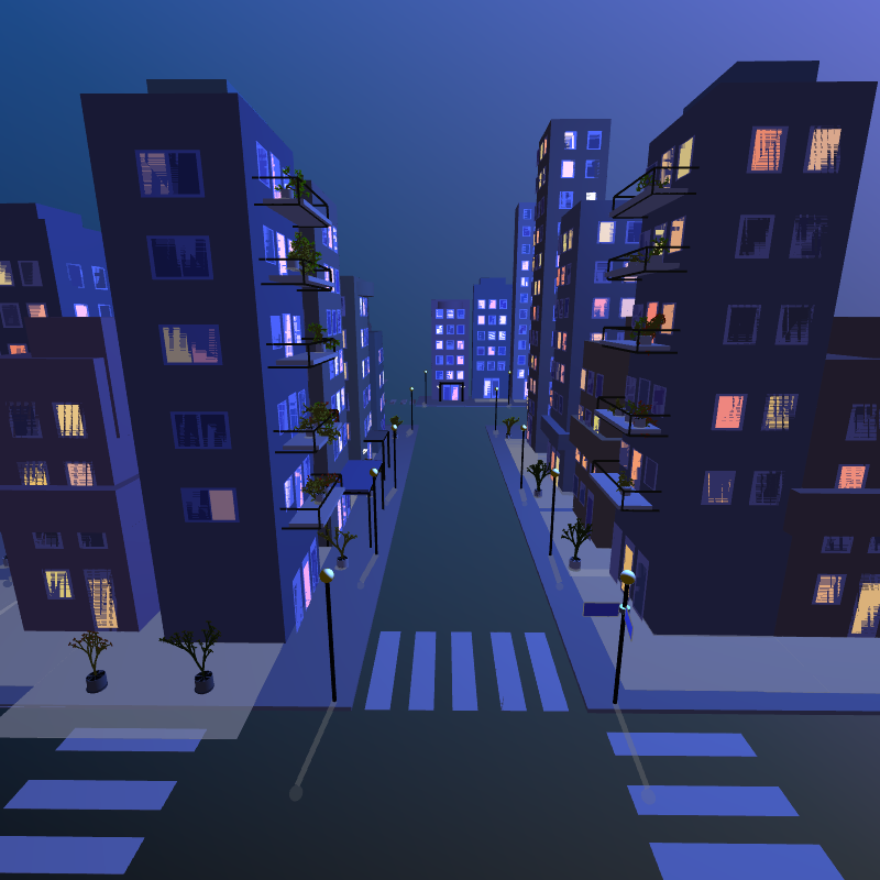 This landscape of buildings can be seen from different angles. Variations include day and night, building position and different color palettes. Only code created entirely in p5.js S2