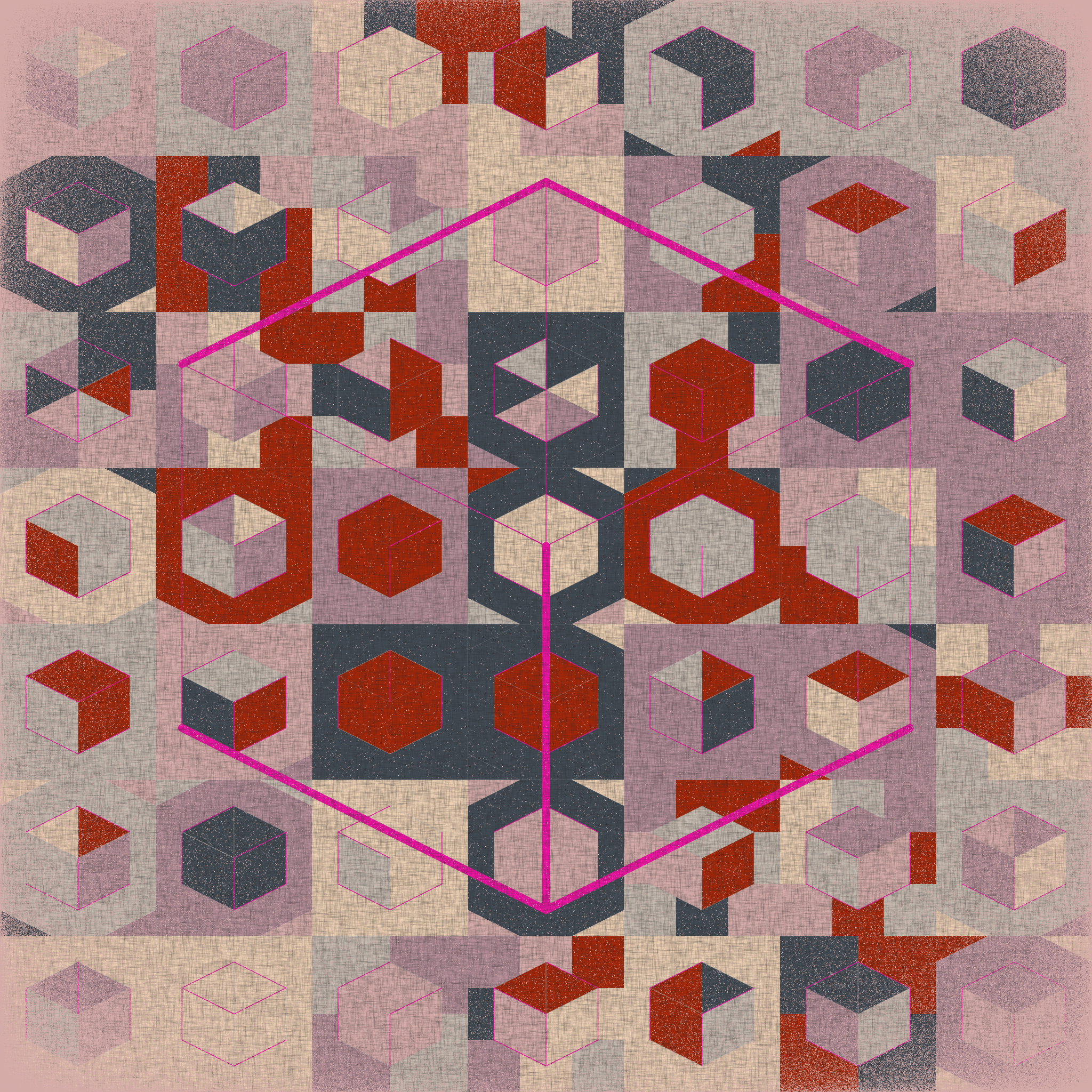 Hexaeder has a wide variety of possible outcomes. I have put together 10 different color palettes; the number of cubes ranges from 10 to 401 (18 different grids); each cell can have 4 different background patterns; each cube can be filled in 4 distinct ways; there are 5 line colors and 16 different "cube figures"; the vignette can be black or be the color of the palette, and there are several "texture settings". This results in over 1.8 million possibilities.