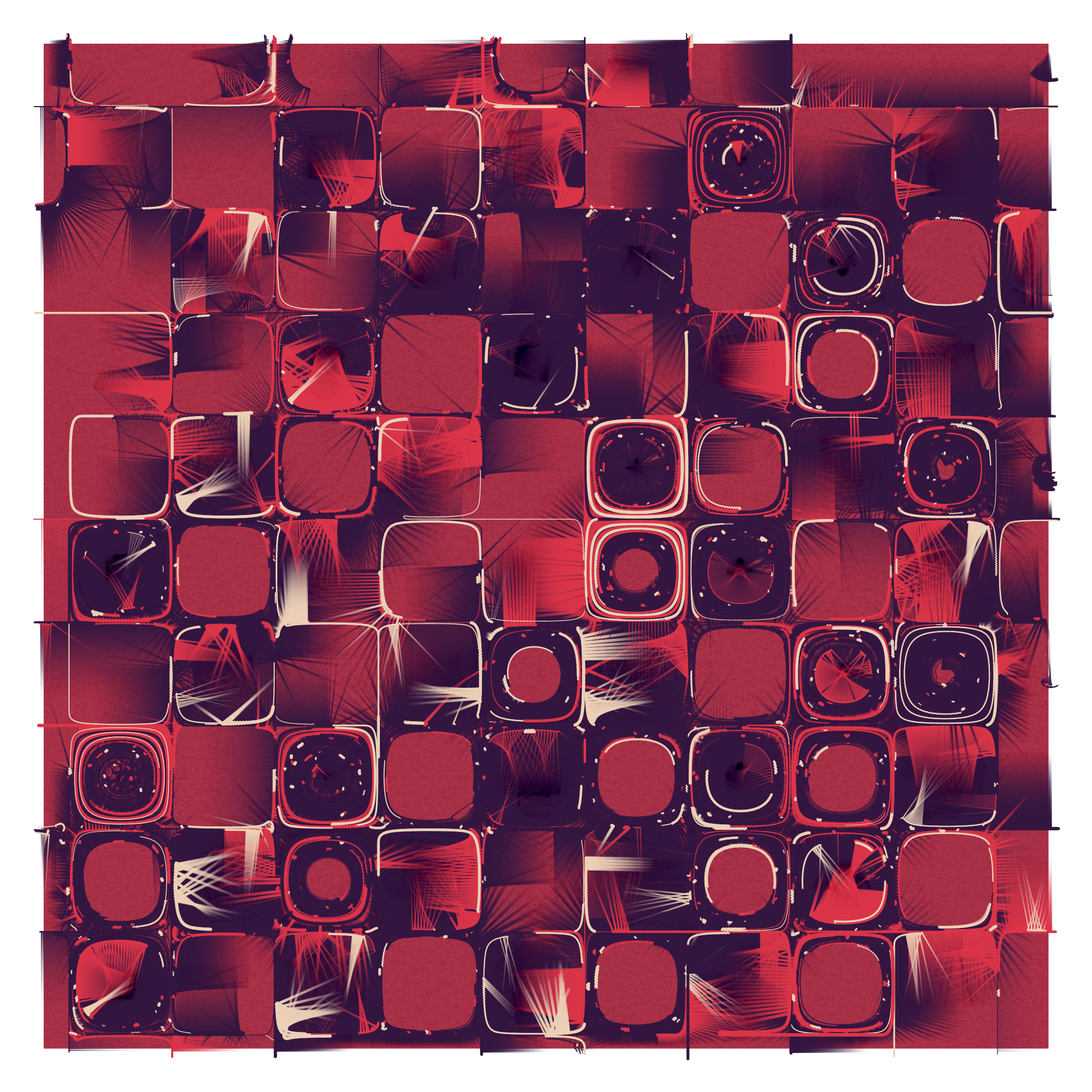 While playing with trigonometric functions, I stumbled upon a set of parameters that could generate the sort of grid-shaped composition you can see in the artwork. Even more interesting to me, the cells in the grid resembled old CRT screens, and through those screens, I could see faraway galaxies, subatomic worlds, sometimes rooms or corridors, plants, analog signals from some mad experiment, ... and maybe you see something else.