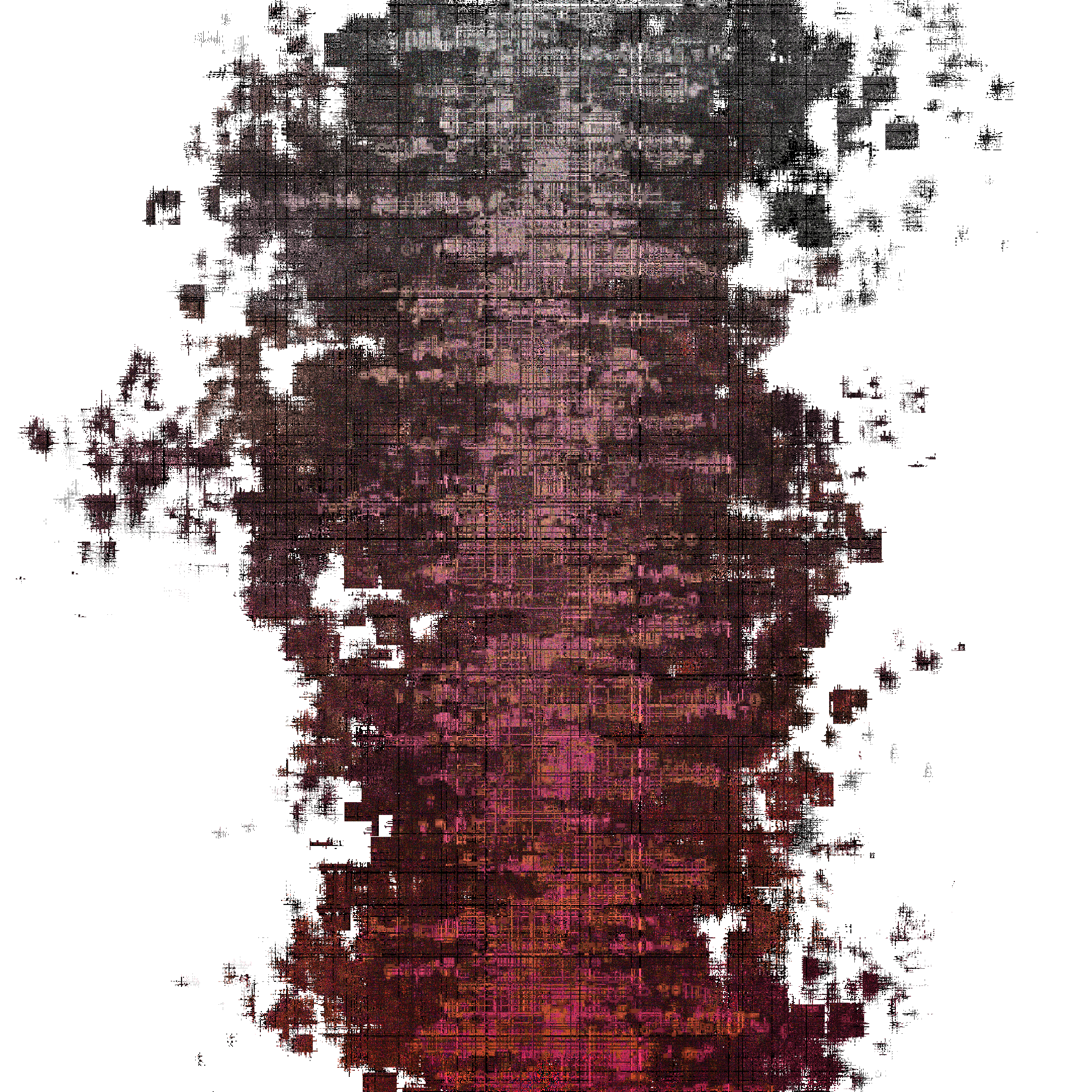 More recursion and self-reference is included throughout the sketch. A recursive "shredding" process is used to render small samples of the image back onto itself, either smaller or larger. A similar technique is used to create the horizontal or vertical "tears" that slice up the screen. These create feed-forward loops where pixel information stored on the screen is used to generate the next change to the image. When the pixel density is high enough (controllable via buttons 1-8 on the keyboard), immense and complicated structures arise in the minute details. An almost fractal-like pattern arises due to the intersection of the recursive nature of these feed-forward loops, and the recursive nature of the seed-loops created by entropy locking. Additionally, the textures are allowed to propagate in an interesting way, due to the use of transparent backgrounds.