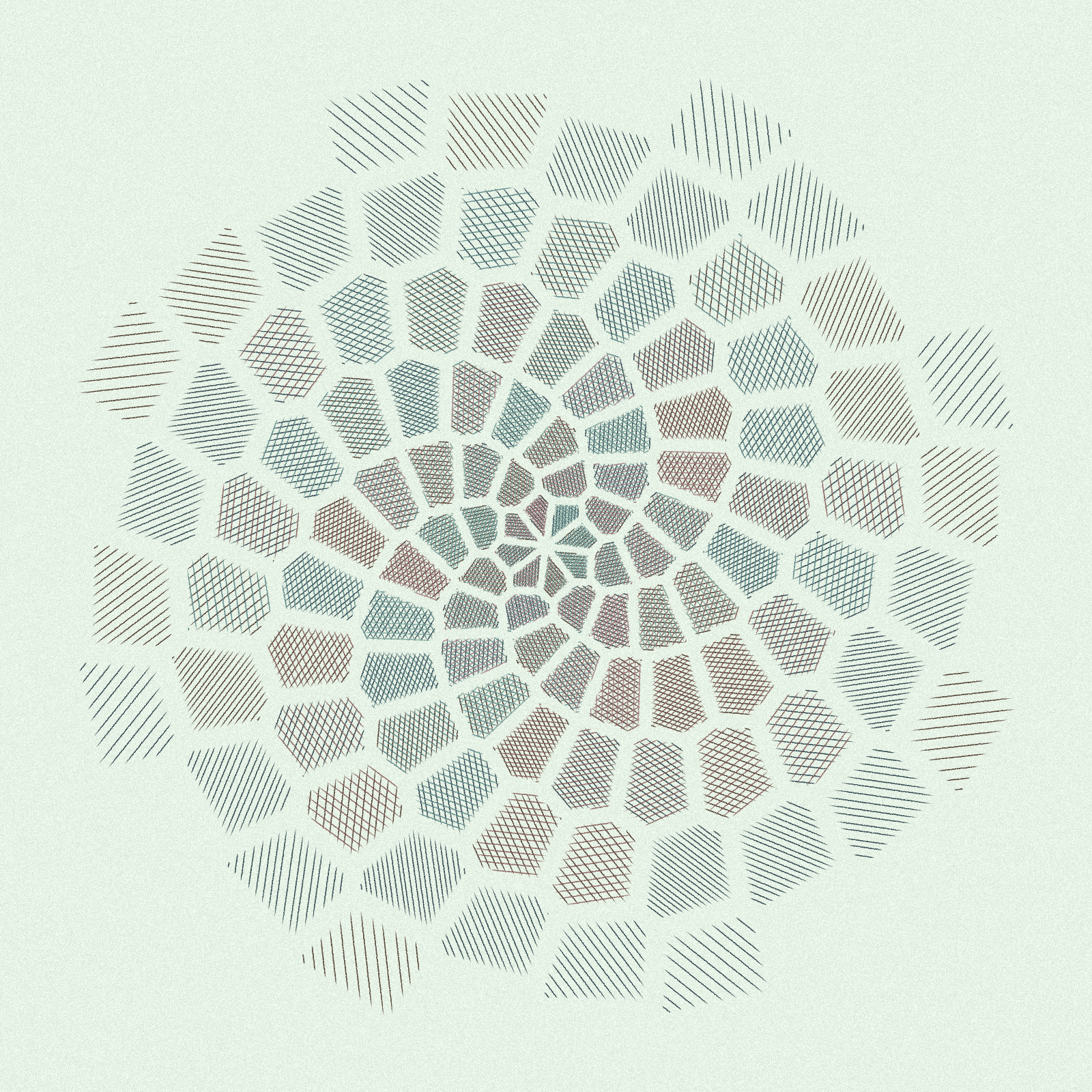 Hatchet: Uzumaki (渦巻) is the first piece in Hatchet; a generative art series that hatches an arrangement of segmented polygons generated via a Voronoi diagram. Uzumaki (Japanese for 'spiral') arranges it's polygons in a multi-armed spiral with varying arm lengths and twist intensities.
